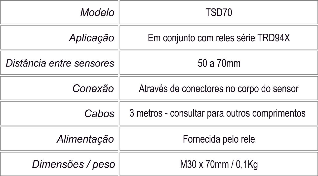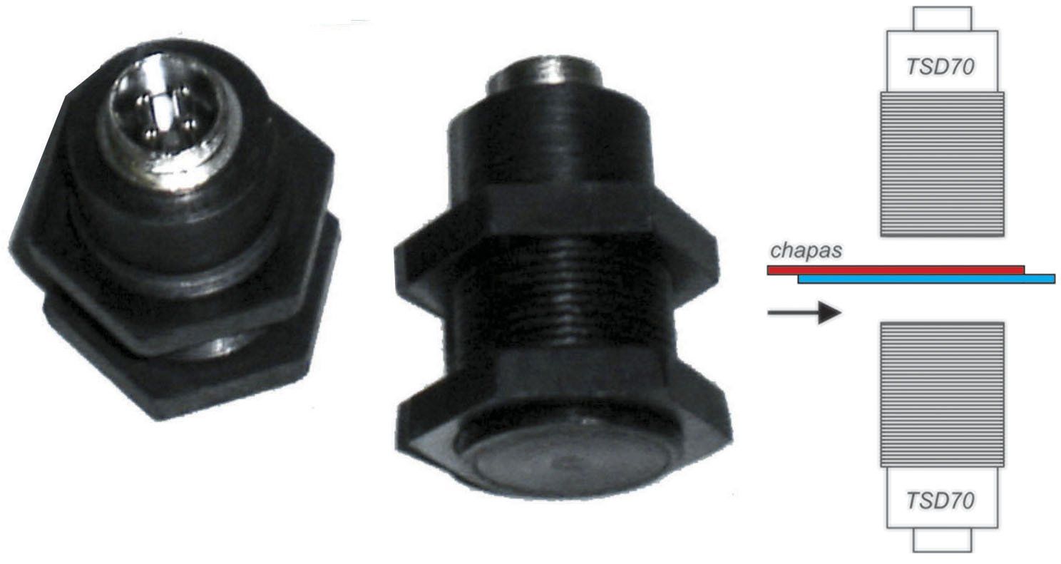 O sistema de tetecção utiliza dois sensores magnéticos TSD70 alinhados, sensíveis à passagem das chapas metálicas entre eles.